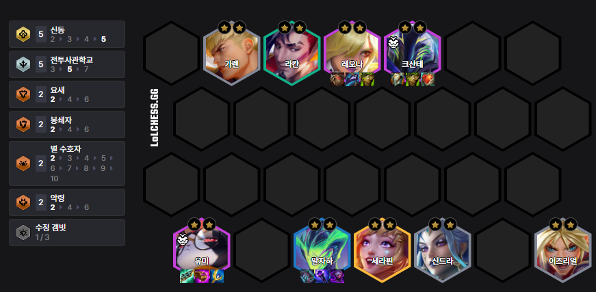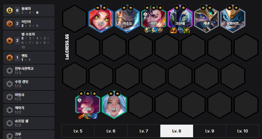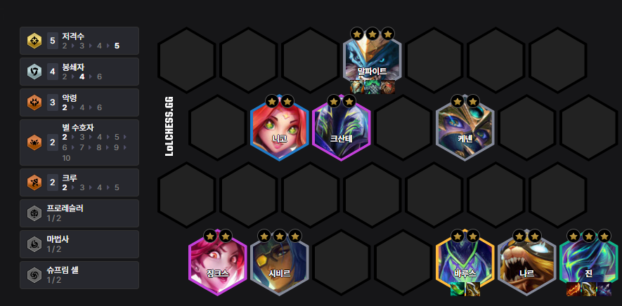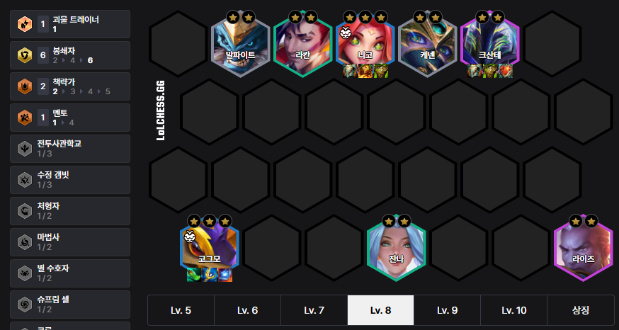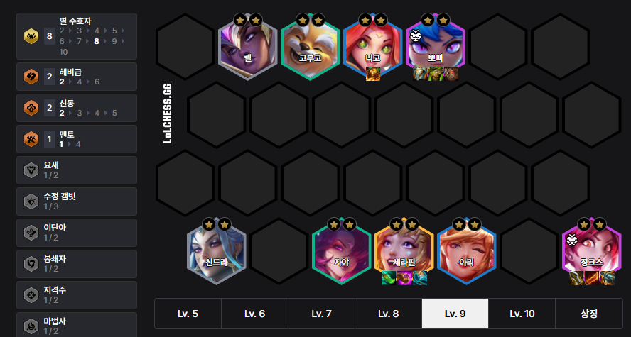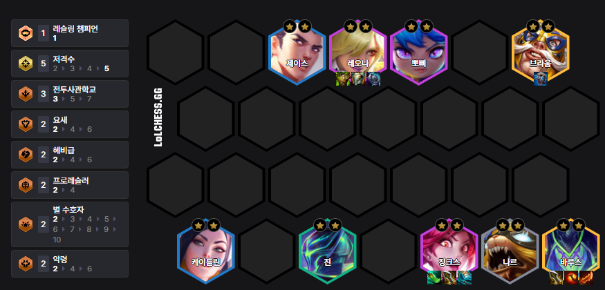 The Bastion Kog'Maw Deck has high stability due to its synergy with the 'Caregiver' power-up. Kog'Maw has a small mana pool, so items like 'Shojin's Spear', 'Archangel's Staff', and 'Guinsoo's Rageblade' are very efficient. Put Kog'Maw in 6 Bastions, and after getting him to 3-star, add Jarvan or Ryze.