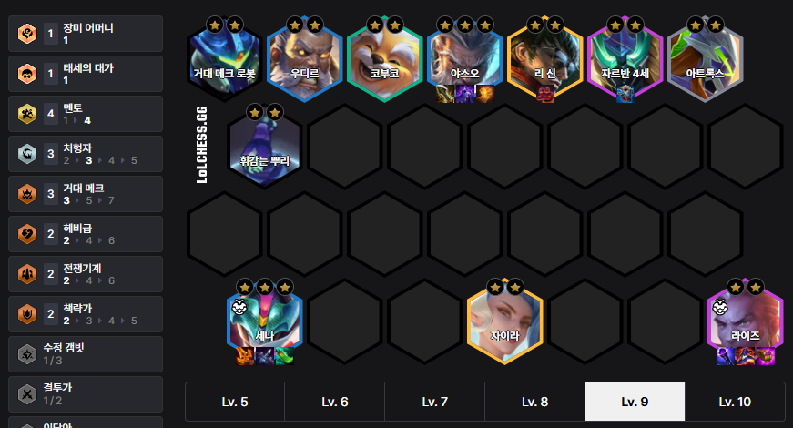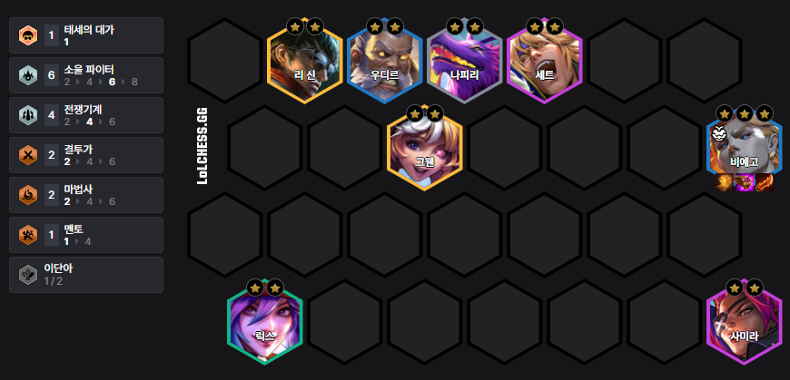 The 8 Soul Fighter Viego carry deck prioritizes Viego 3-star, with Guinsoo's Rageblade, defensive items, and Jeweled Gauntlet being key. We recommend a build-up using Giant Beast, and at level 7, form a combination of 6 Soul Fighter + Udyr, and at level 8, 6 Soul Fighter + 4 War Machine. We recommend Elastic Arms as Viego's power-up.