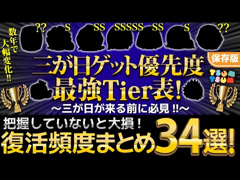 ツムツム:三が日限定!ゲット優先度ティア表と復活頻度まとめ(2025年版)2025年のツムツム三が日(さんがにち)イベントで狙うべきツムの優先度を、復活頻度別に解説。特にSSランクのツムは1年に1度しか復活しないため、優先的にゲット推奨。Sランク以下のツムは、復活頻度が高いため無理に狙う必要はない。