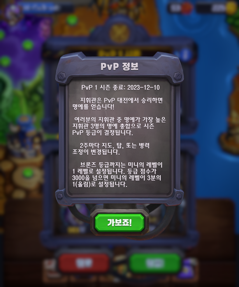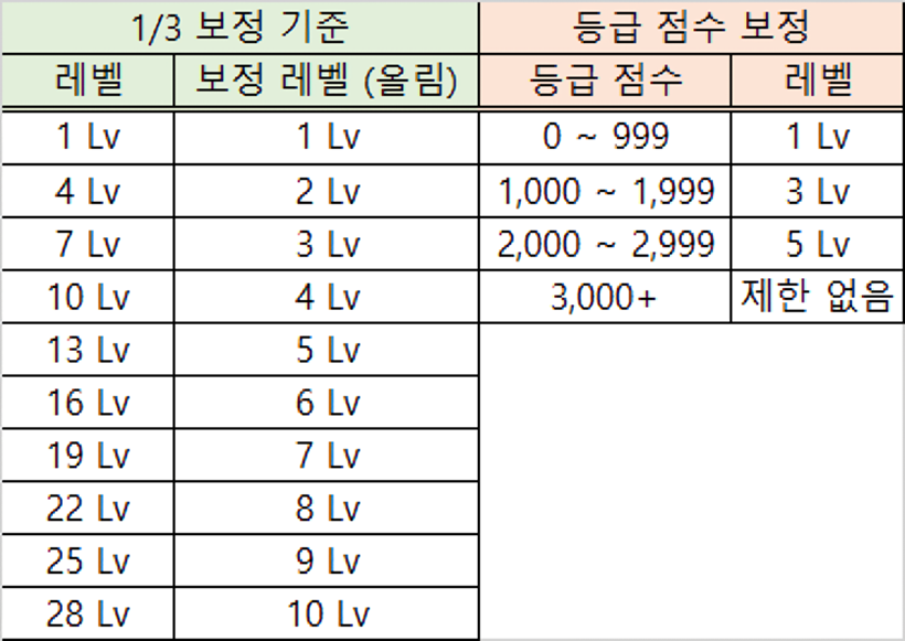 워크래프트 럼블에서는 PvP에 레벨 보정이 들어갑니다!사진에서 보이듯 브론즈 등급(~3,000)까지는 미니의 레벨이 1로 보정이 된다고 안내합니다.하지만 레벨 보정에 관한 자세한 내용이 없어 제가 표를 만들어 정리해왔습니다!레벨 보정을 정리하면 이렇습니다.등급 점수가 3,000점이 넘어가면 등급 점수 보정 레벨이 사라지게 되니 3,000점 이상이신 분들은 PvP하실 때 주의해주세요!