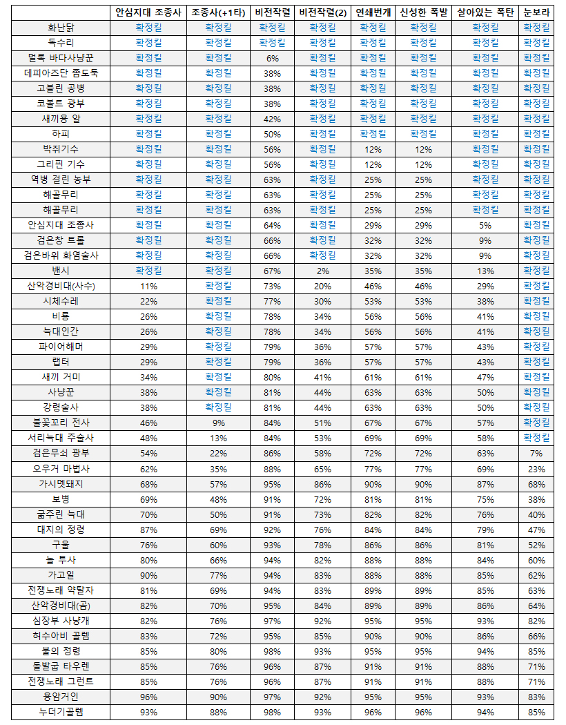 동레벨 기준으로 각 광역기들이 단일 대상에게 입히는 피해와 피해를 준 후 남는 생명력은 아래에서 확인하실 수 있습니다.