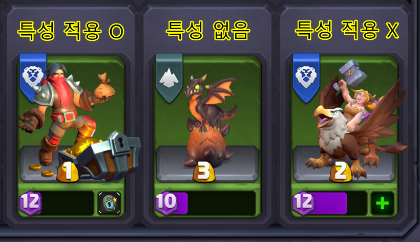 미니들의 특성은 장착하는 개념이라 특성이 있어도 적용을 하지않으면 특성없이 플레이를 하게됩니다.왼쪽부터 특성이 있고 적용까지 한 모습, 고급이지만 특성이 없어 칸 자체가 없는 모습, 특성이 있지만 적용하지 않은 모습입니다.혹시 오른쪽으로 게임을 하고 계신분이 있으시다면, 안좋은 특성이라도 없는 것 보단 나으니 꼭! 적용하시길 바랍니다!