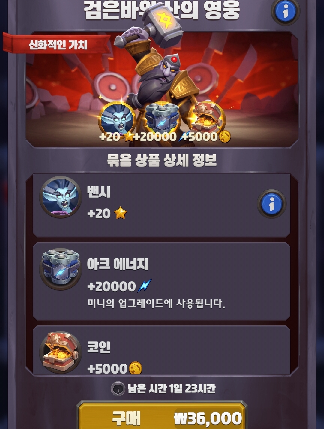 검은바위 산 영웅 클리어 시 이틀 간 판매되는 1회성 패키지 정보 입니다.