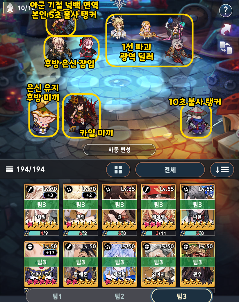 3군은 보통 광역 범위가 좁거나 단일 위주에 성급이 낮은 영웅으로 짜야 함