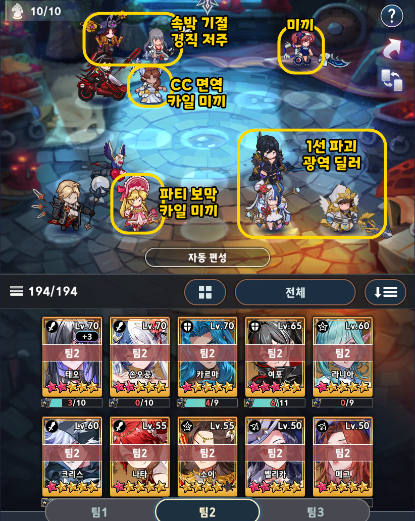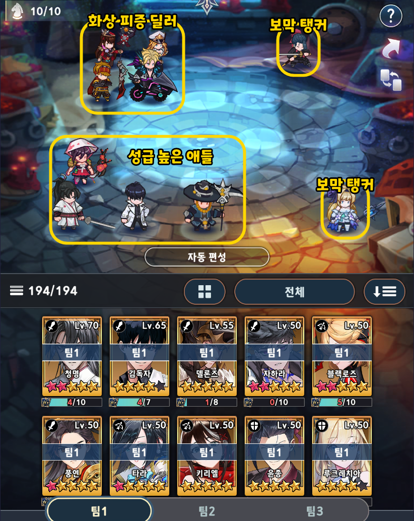 보통 팀1~2에 1군 덱이 편성되므로 살을 내주고 뼈를 취하는 것