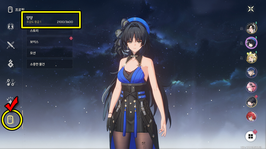 각 캐릭터별 호감도 레벨은 메뉴에서 공명자 - 하단의 군번줄 아이콘을 클릭하면 볼 수 있어요~