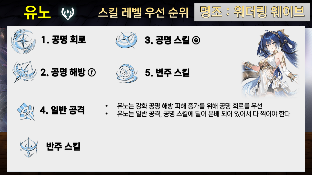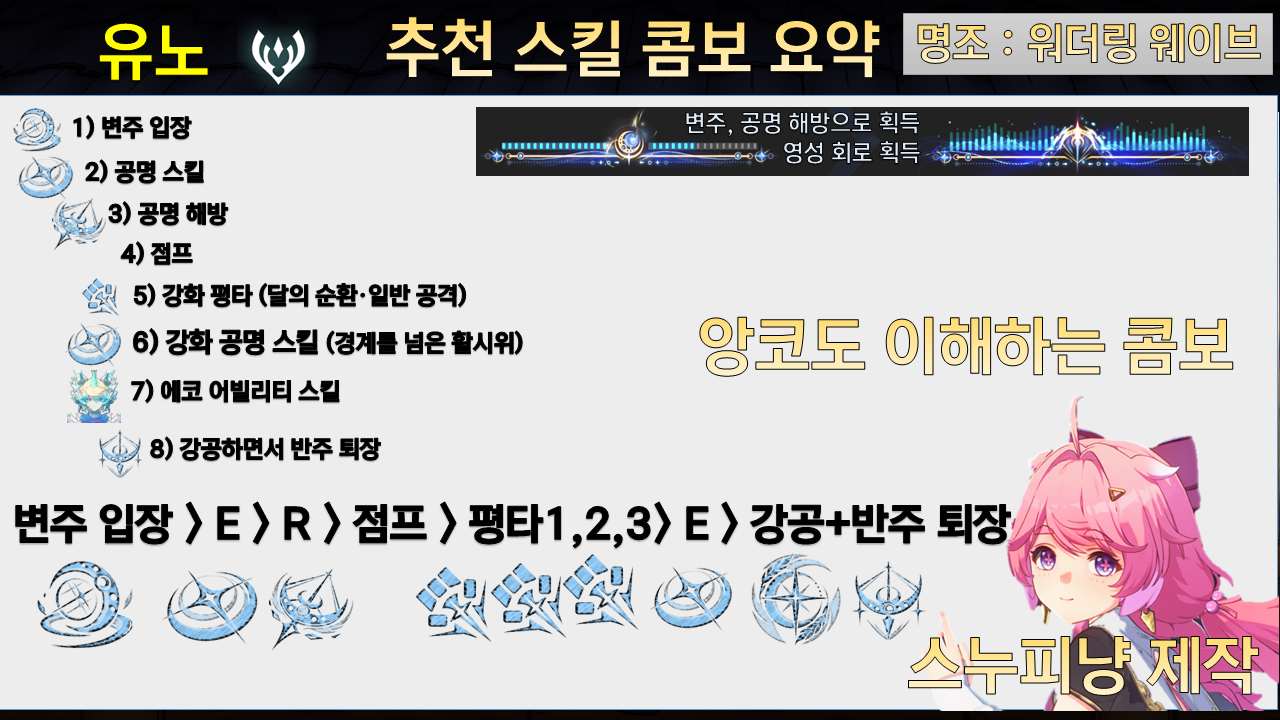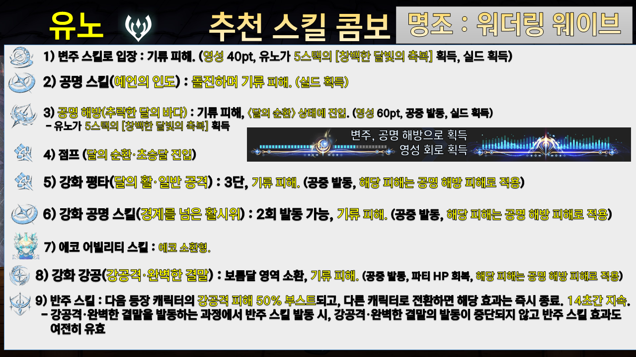 위와 같으며, 고유 명사가 많은 스킬 설명이지만, 자연스럽게 스킬 콤보를 할 수 있는 유노의 스킬 콤보는 간단하여