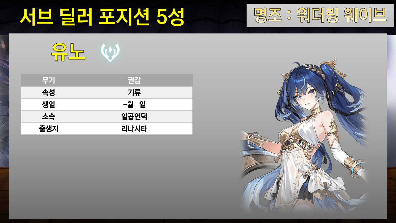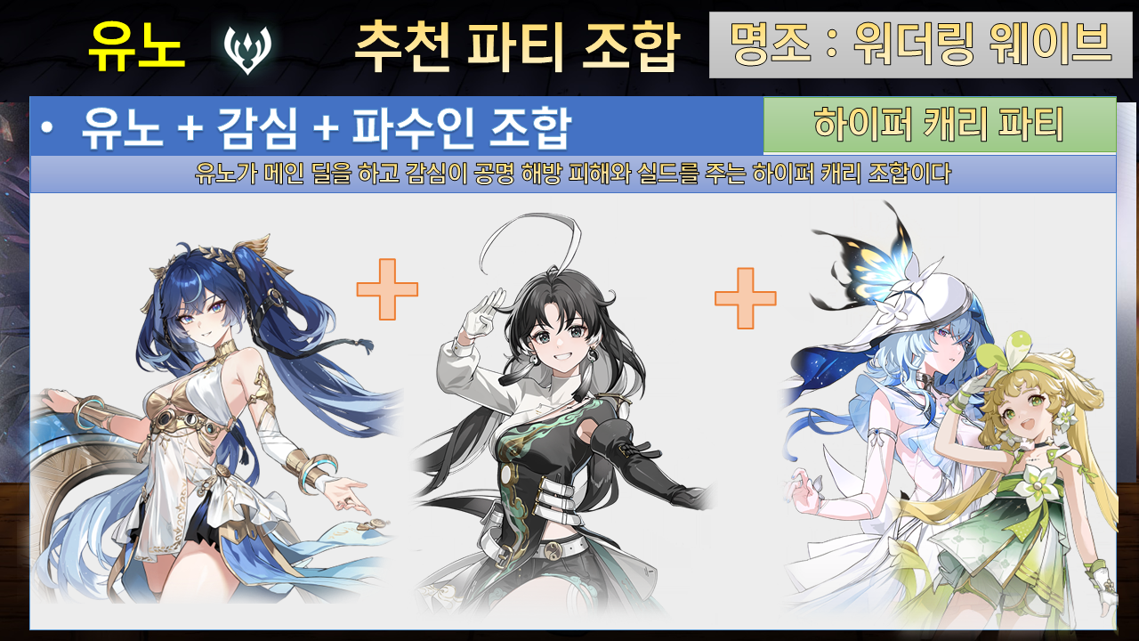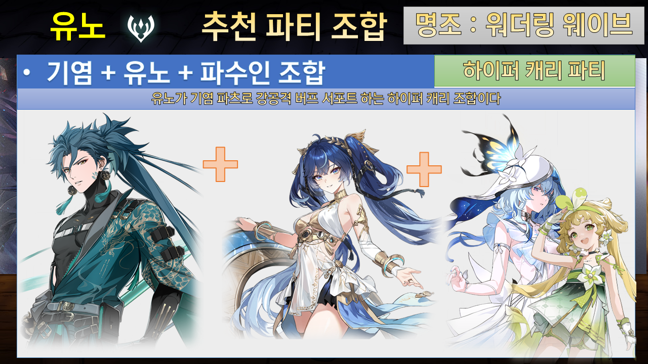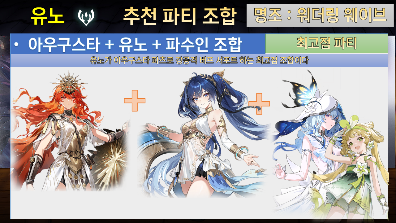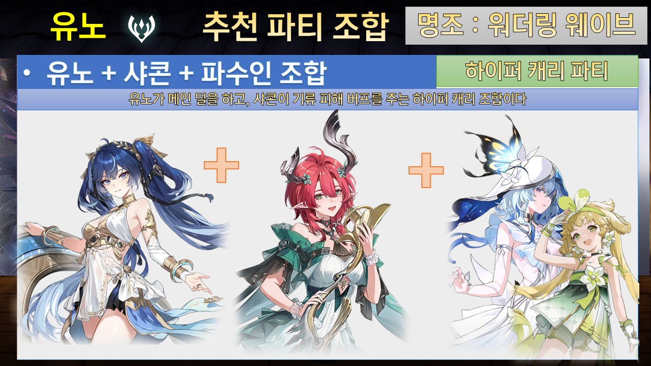 유노를 픽업하여 강공격 버프를 받는 메인딜러를 조합하고, 파수인을 넣어도 괜찮을 것입니다.