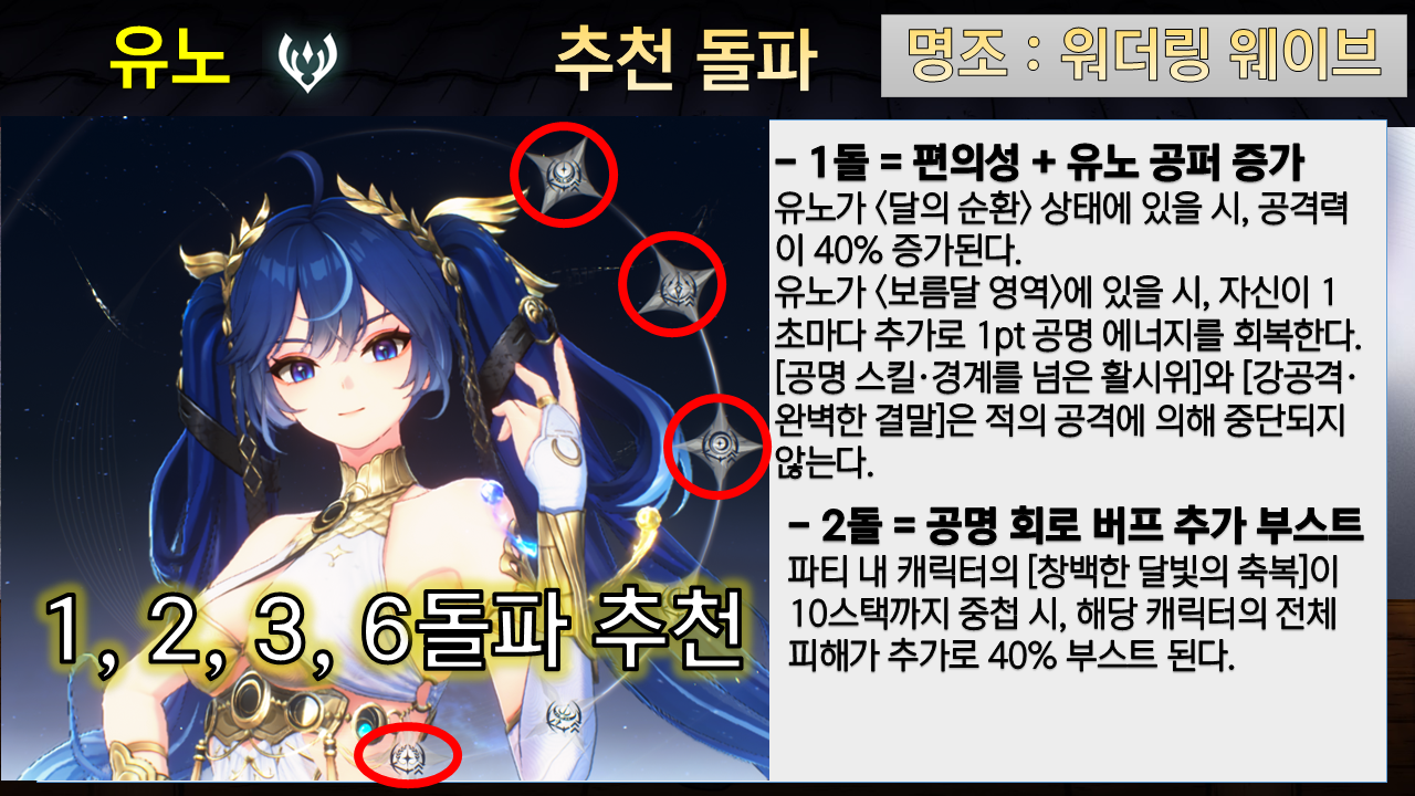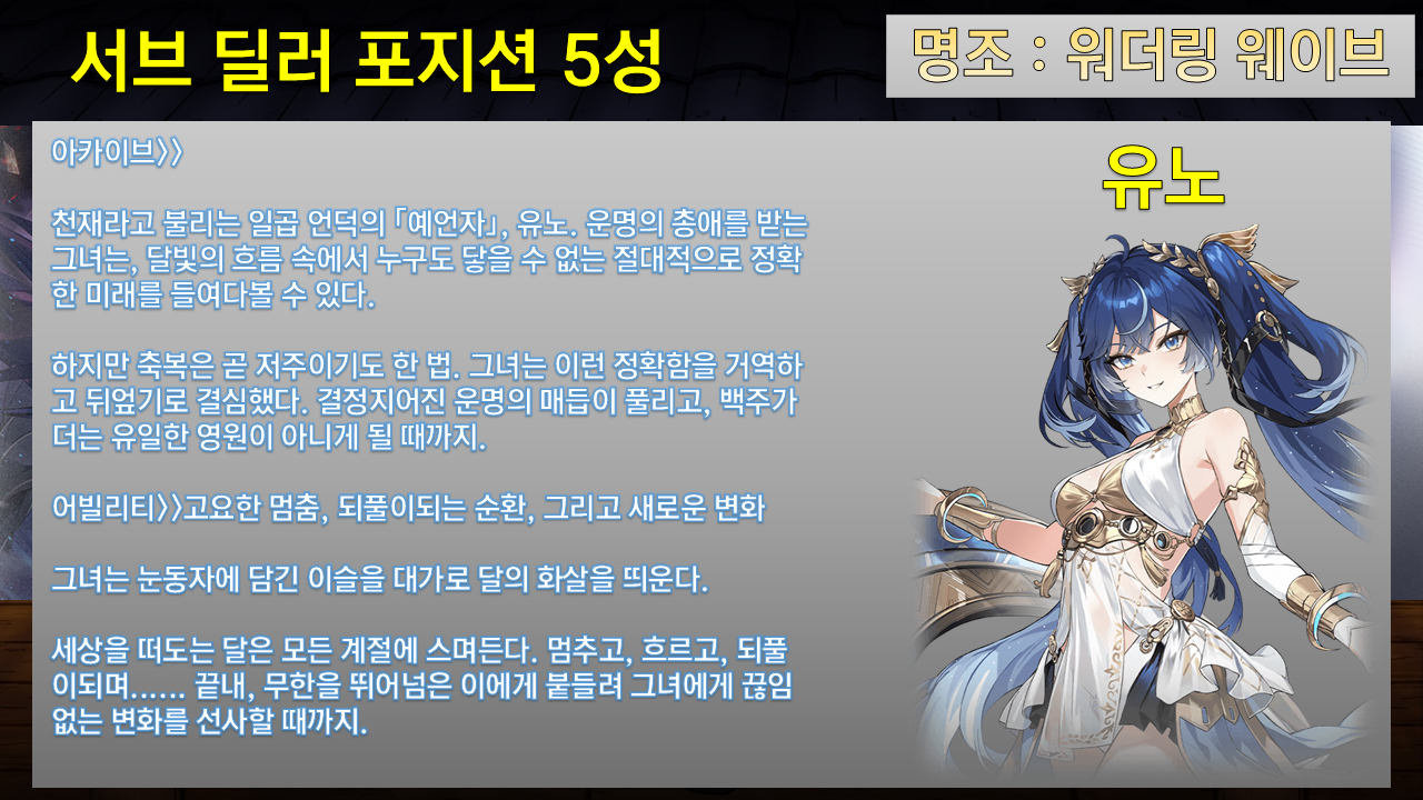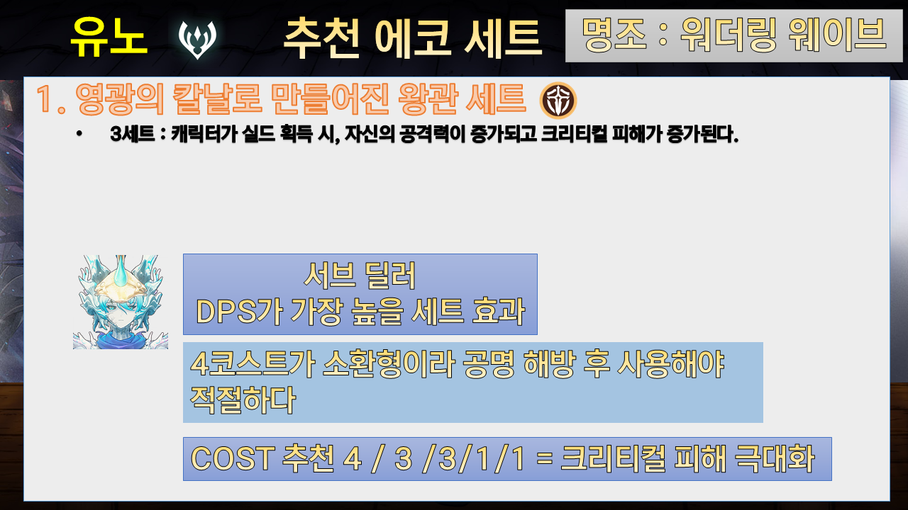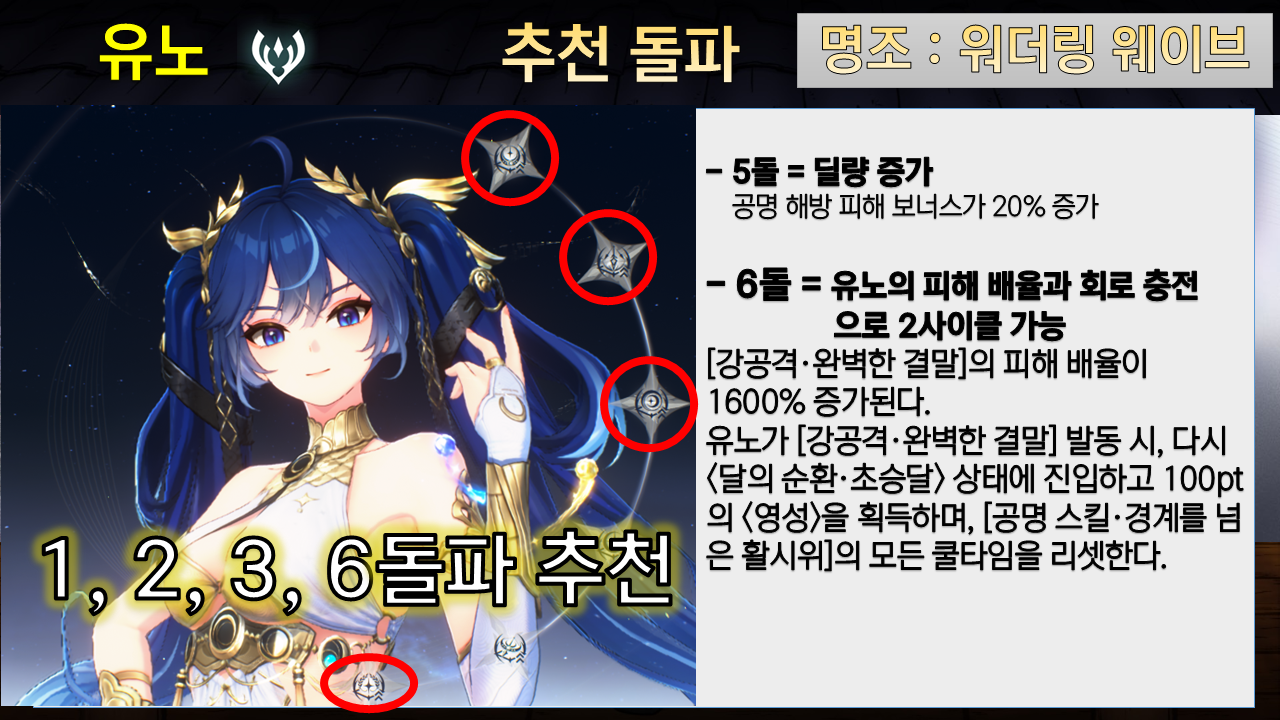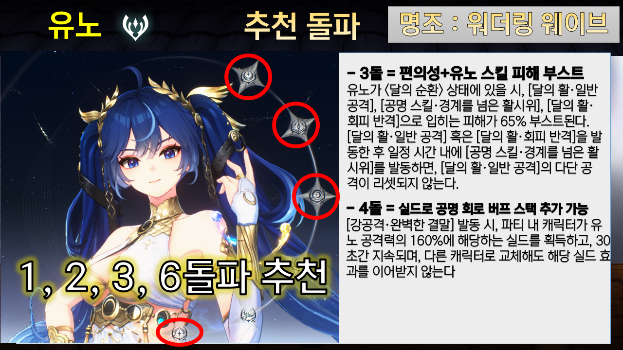유노를 픽업하여 강공격 버프를 받는 메인딜러를 조합하고, 파수인을 넣어도 괜찮을 것입니다.