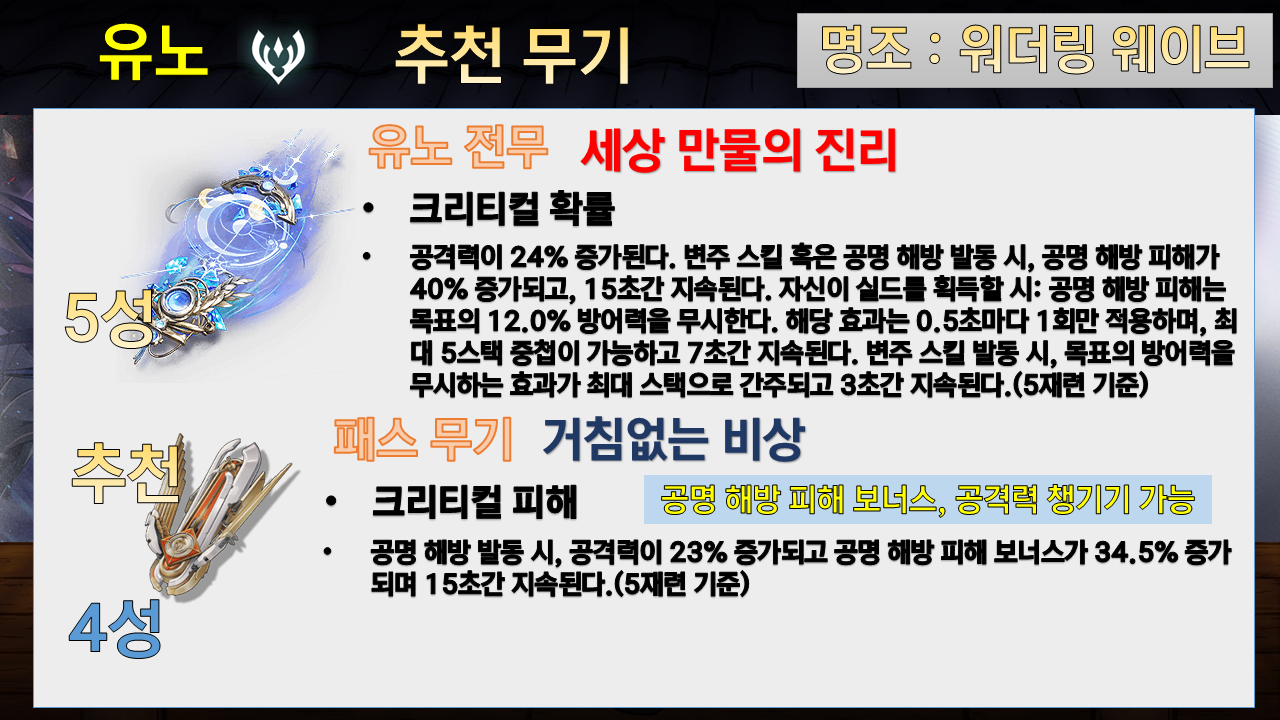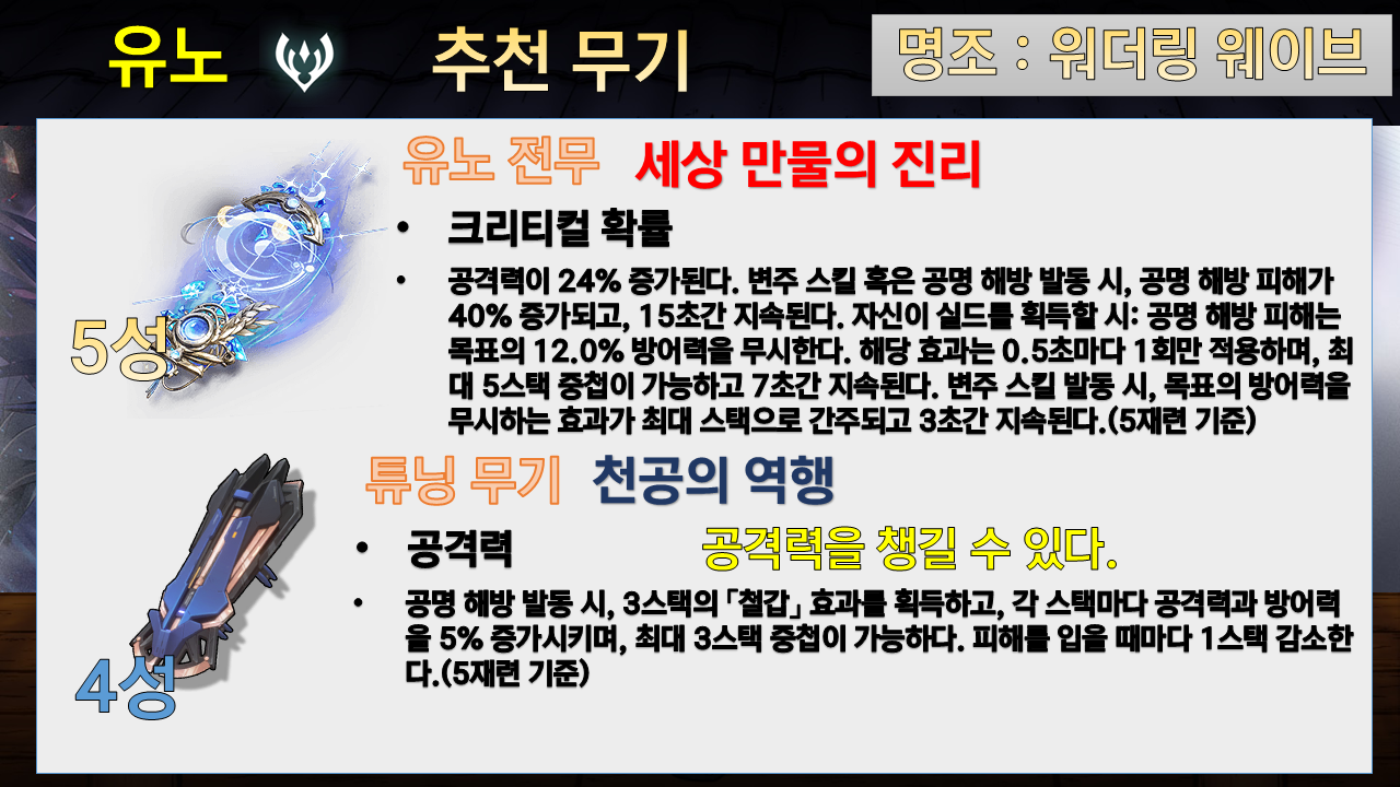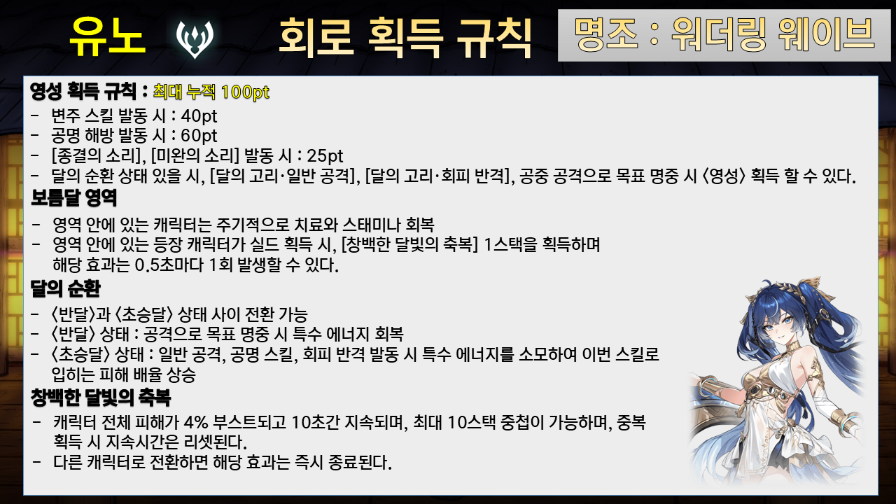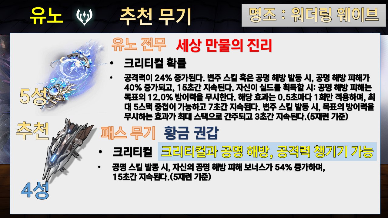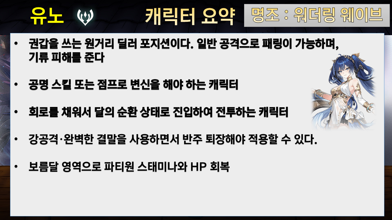 유노의 종합 가이드로 에코 세팅, 무기 추천, 스킬 설명, 딜 사이클에 대한 설명을 담았습니다.